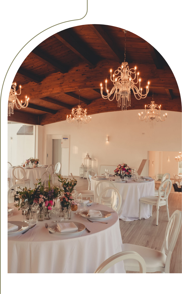Una scalinata fiabesca che ti accompagna verso una vista panoramica a cui fa da sottofondo un raffinato gioco d’acqua. Soffitto in legno dai colori caldi ed intensi che fa contrasto con il bianco opaco delle pareti e dal quale risplendono eleganti e sofisticati lampadari con pendenti. Una sala adatta ad ogni tipo di allestimento che sa raccontare la storia di ogni evento.