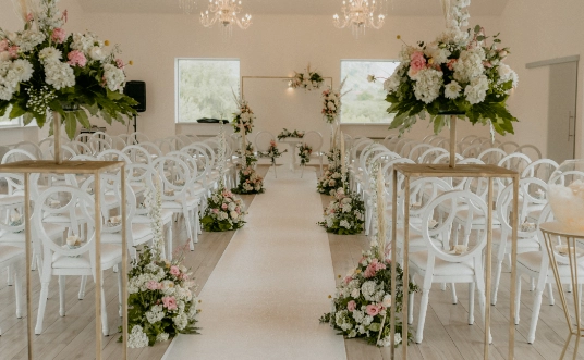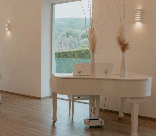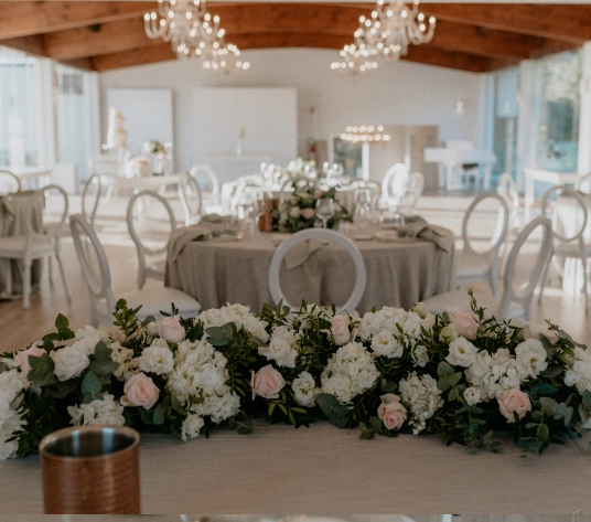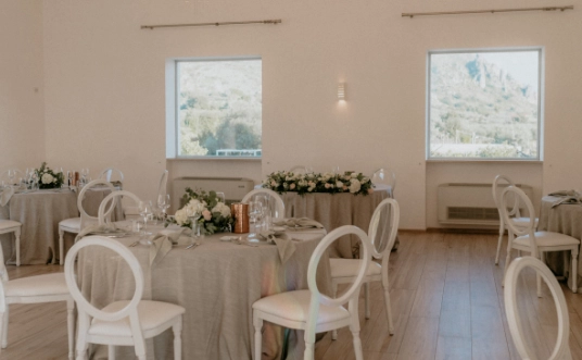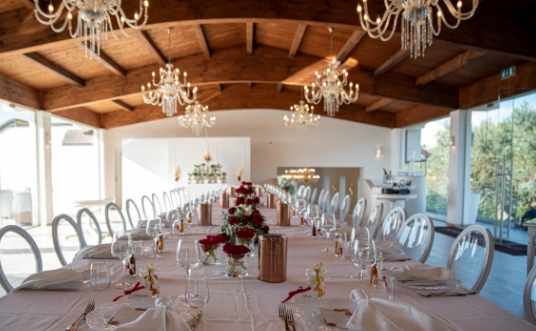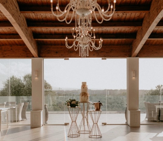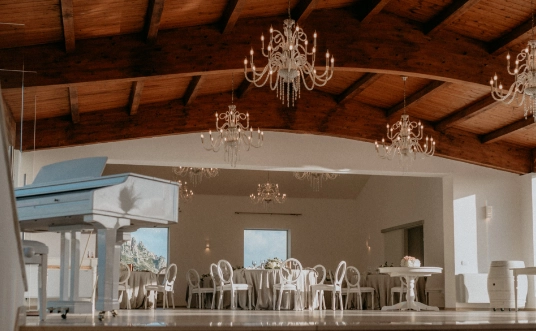 Una scalinata fiabesca che ti accompagna verso una vista panoramica a cui fa da sottofondo un raffinato gioco d’acqua. Soffitto in legno dai colori caldi ed intensi che fa contrasto con il bianco opaco delle pareti e dal quale risplendono eleganti e sofisticati lampadari con pendenti. Una sala adatta ad ogni tipo di allestimento che sa raccontare la storia di ogni evento.